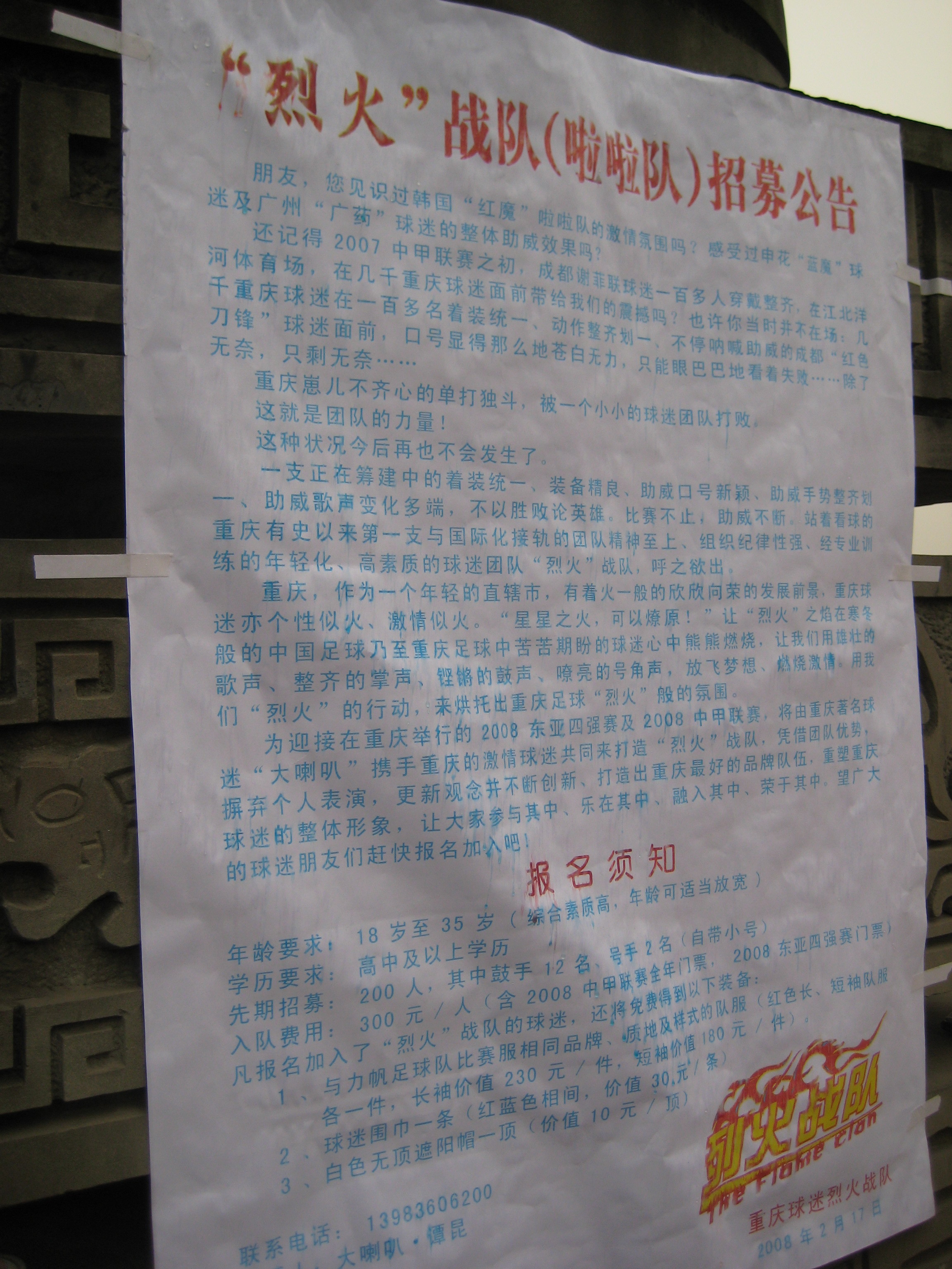 お揃いのはちまきをした約30人がドラムを叩いてみんなで歌う。どうやら応援団を募集しているようなポスターが張ってあった。”烈火”や“紅魔”などという威勢のいい文字が踊っている。募集要項にはメンバーが200名、ドラムが12名、コールリーダーが2人と具体的だ。