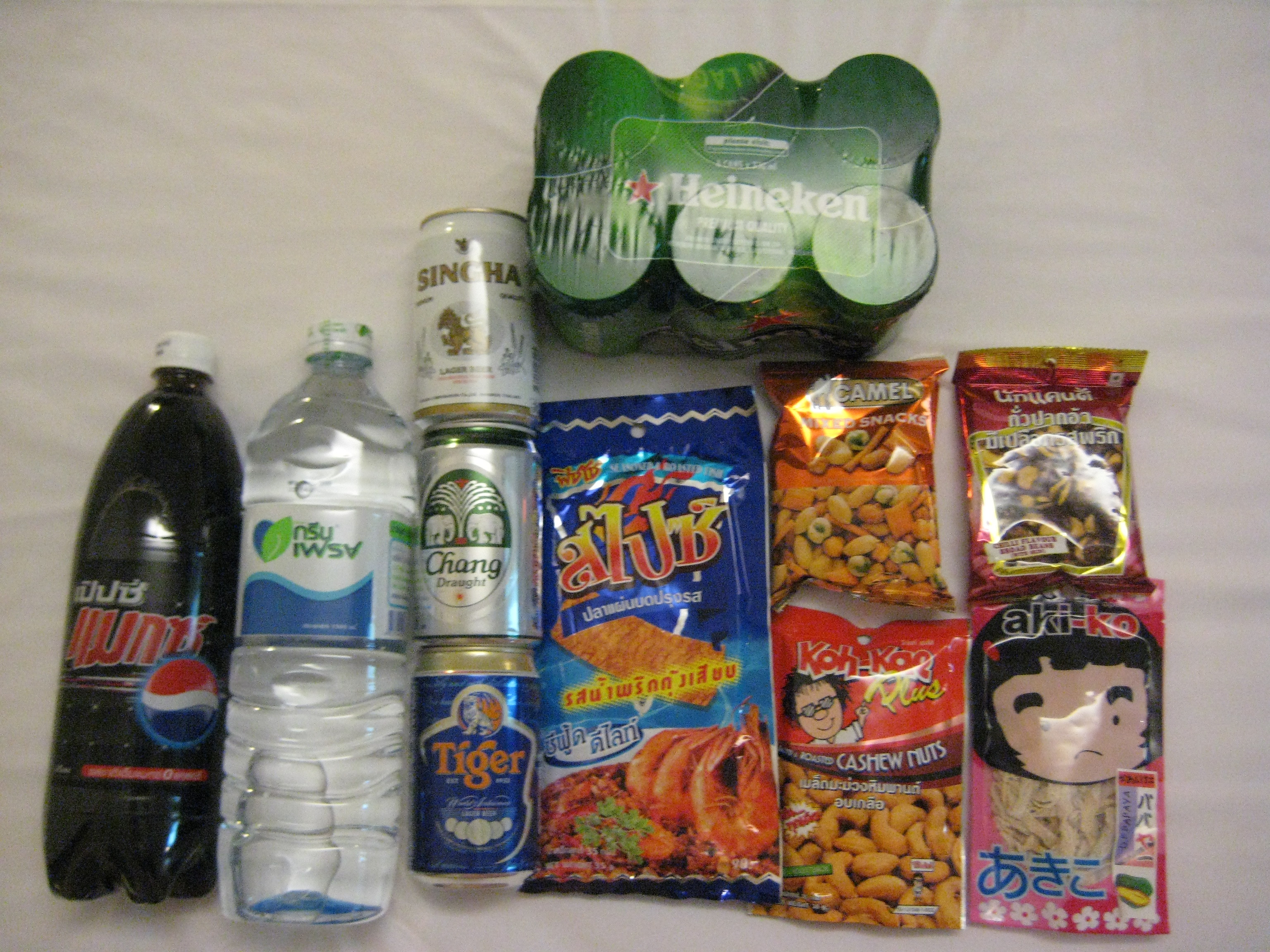 物価が安いのでたっぷりビールまで買えました。右下のお菓子はなぜか「あきこ」という名前。しかもシリーズものです。味は……現地風でした。